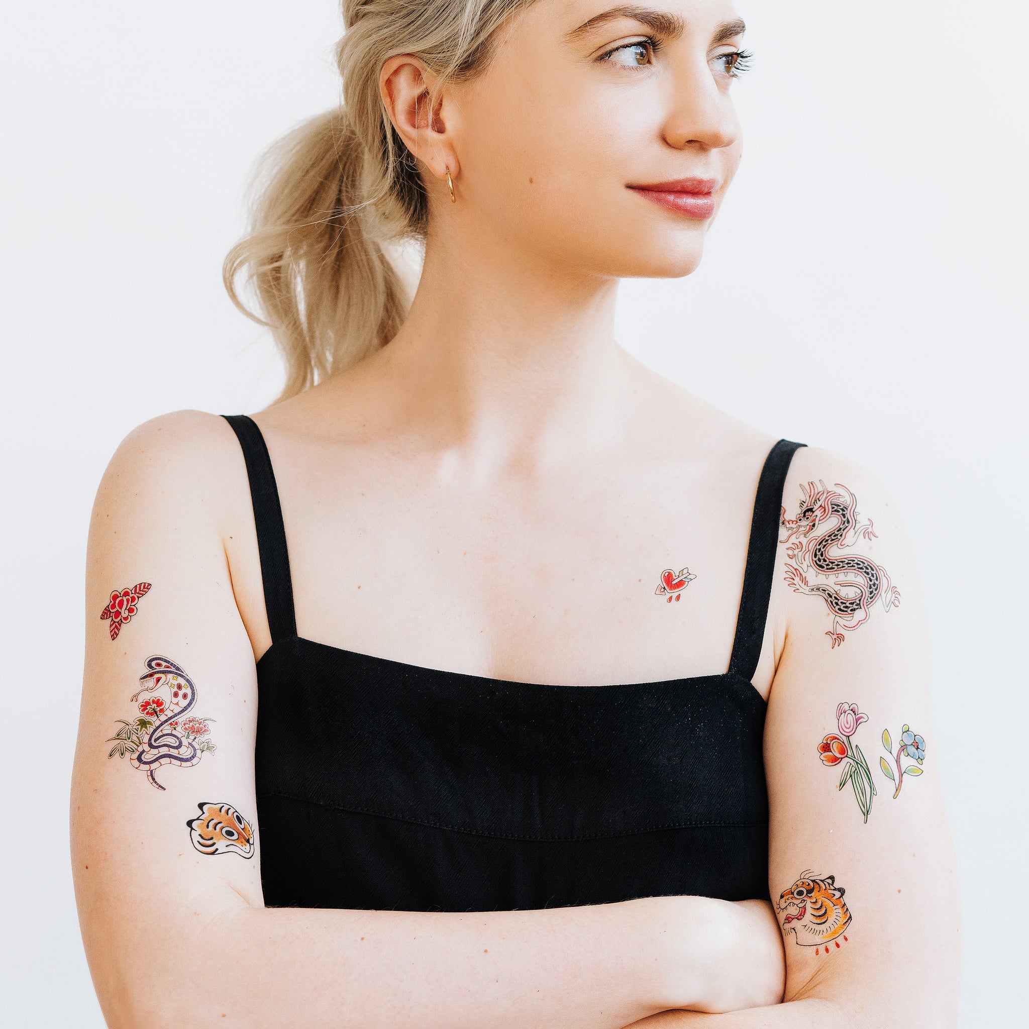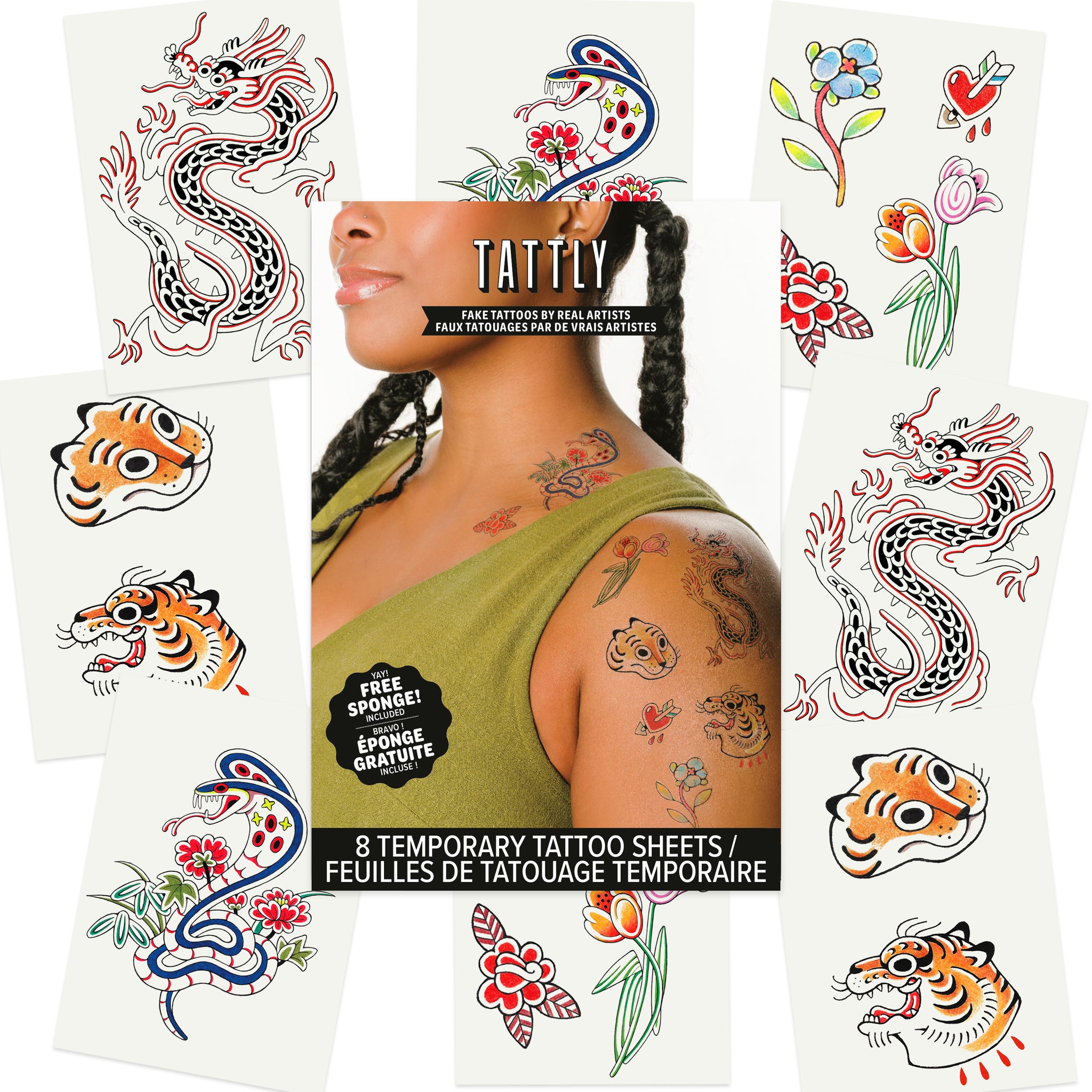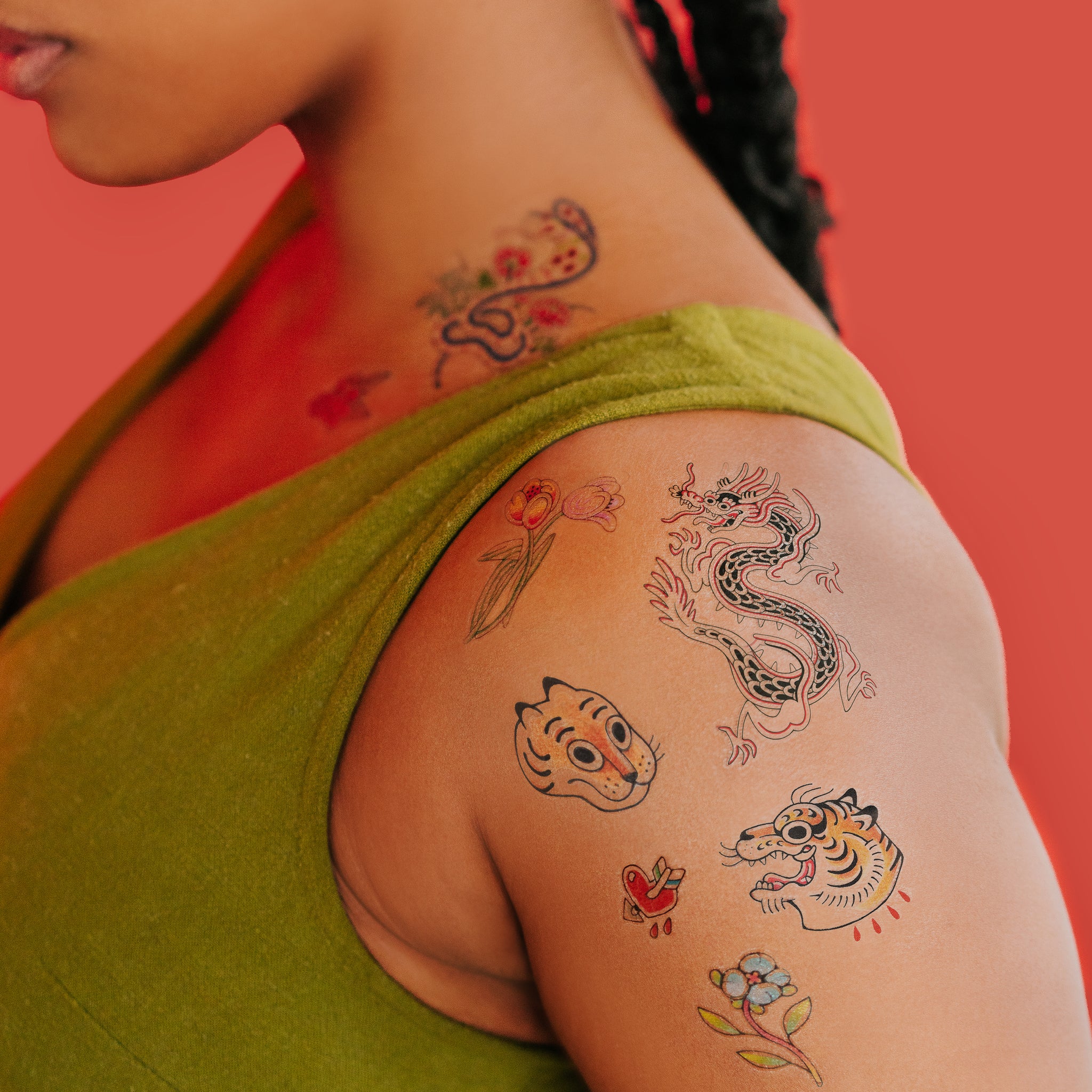 Sink your claws into our Fierce & Friendly Tattoo Set designed by New York City-based tattoo artist, Gossamer Rozen. We keep it sweet and salty with a vintage dragon, a snake that slays, fierce tigers, and gorgeous florals.